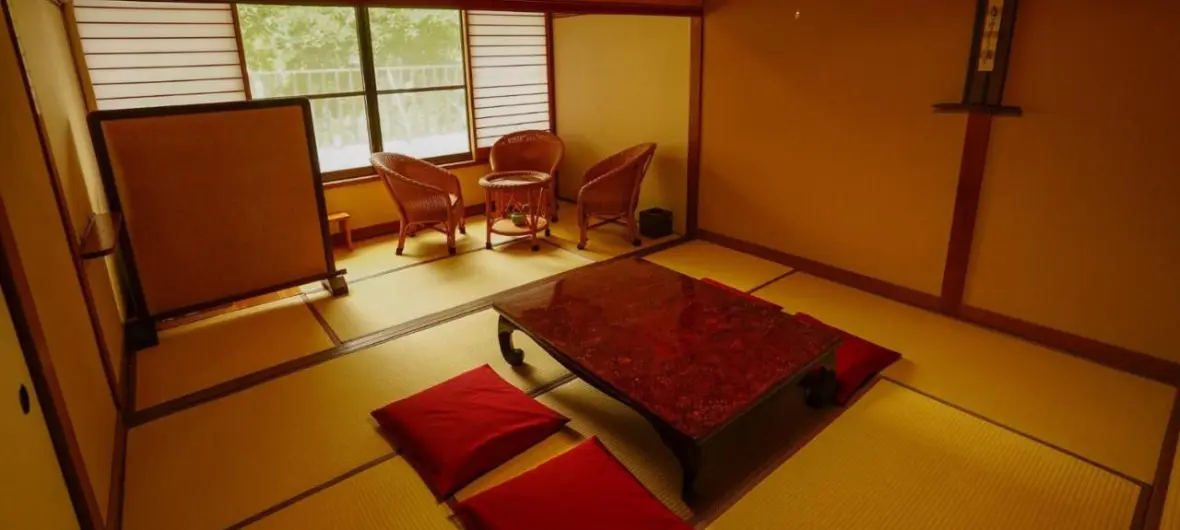 テラスはありませんが、桂川を眺められる広縁があります。1月の終わり頃には、窓一面紅葉の赤を楽しむことができます。