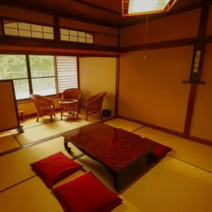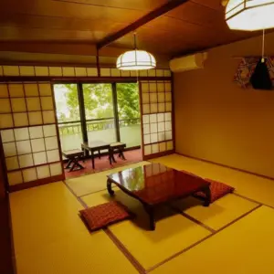 テラスはありませんが、桂川を眺められる広縁があります。1月の終わり頃には、窓一面紅葉の赤を楽しむことができます。